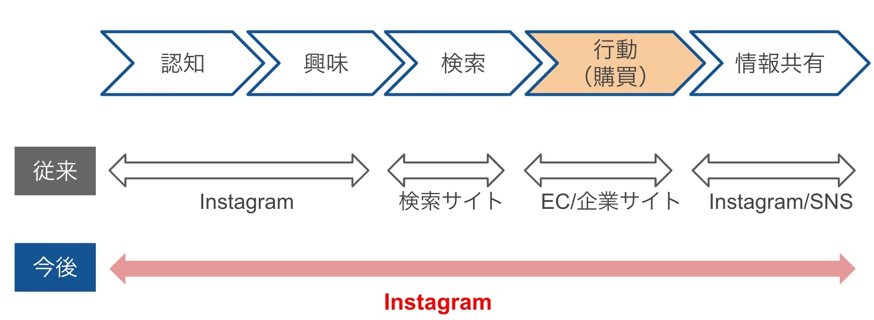 購買ステップは「認知」「興味」「検索」「行動(購買)」「情報共有」に分かれます。従来であれば、認知・興味はInstagramで喚起できますが、検索や行動の際は検索サイトやECサイトに遷移する必要がありました。