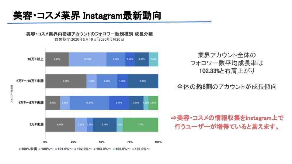 業界全体のフォロワー数平均成長率は102.33%と右肩上がりで、全体の約8割のアカウントが成長傾向にあります。このことから、企業側からのインスタグラム上での情報発信がより活発になってきているということが分かります。また、フォロワーが増えているということは、消費者側も美容・コスメに関する情報をインスタグラム上で収集しているということも分かります。