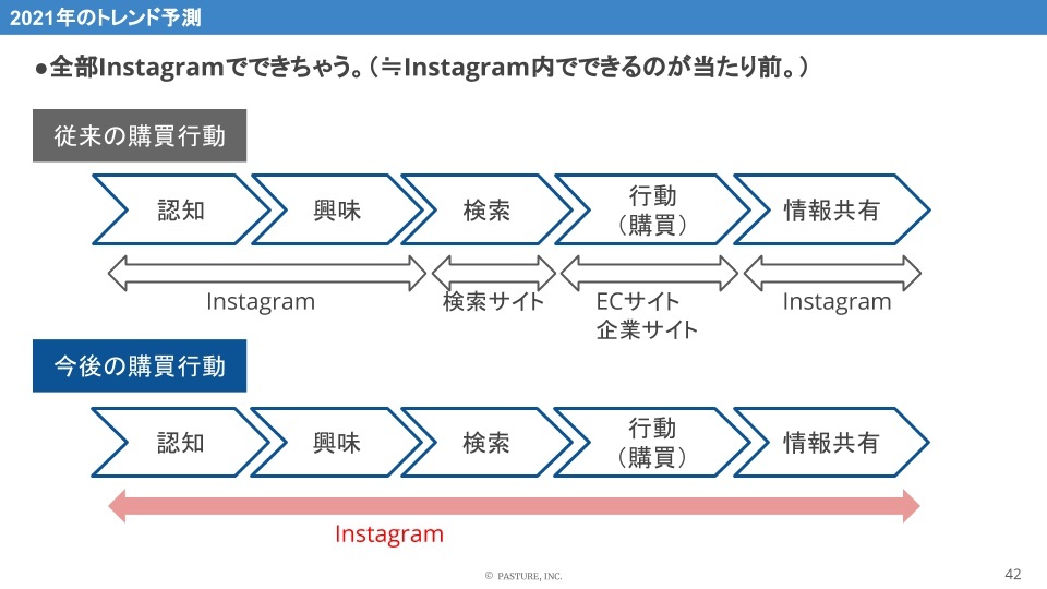 さらにFacebook社は、インスタグラムのECプラットフォームとしての側面を強化することを明言しており、認知から購買、情報共有までインスタグラム上で一貫して完結するようになります。