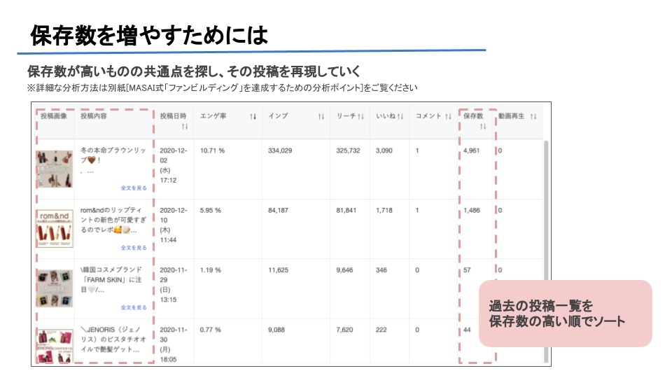 保存数を増やすには、過去の投稿一欄を保存数の高い順でソートし、保存数が高い投稿の共通点を探します。